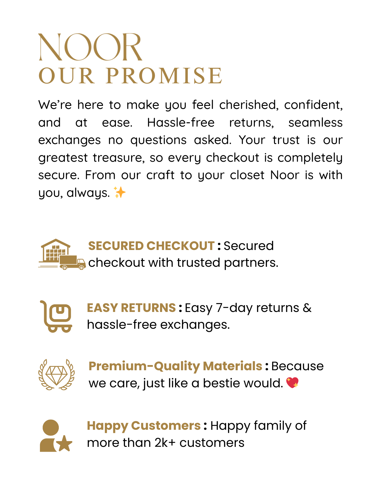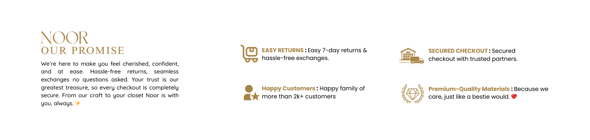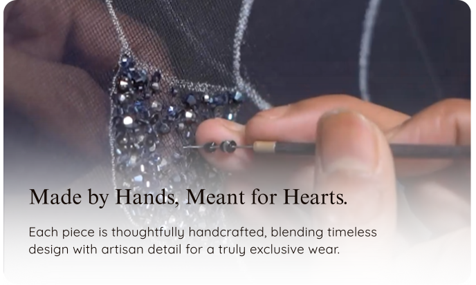 Every Noor piece begins with a story told through handpicked fabrics and finished by human hands, not machines. We don’t follow seasons; we create moments you never forget. Limited, not by demand, but by intention.