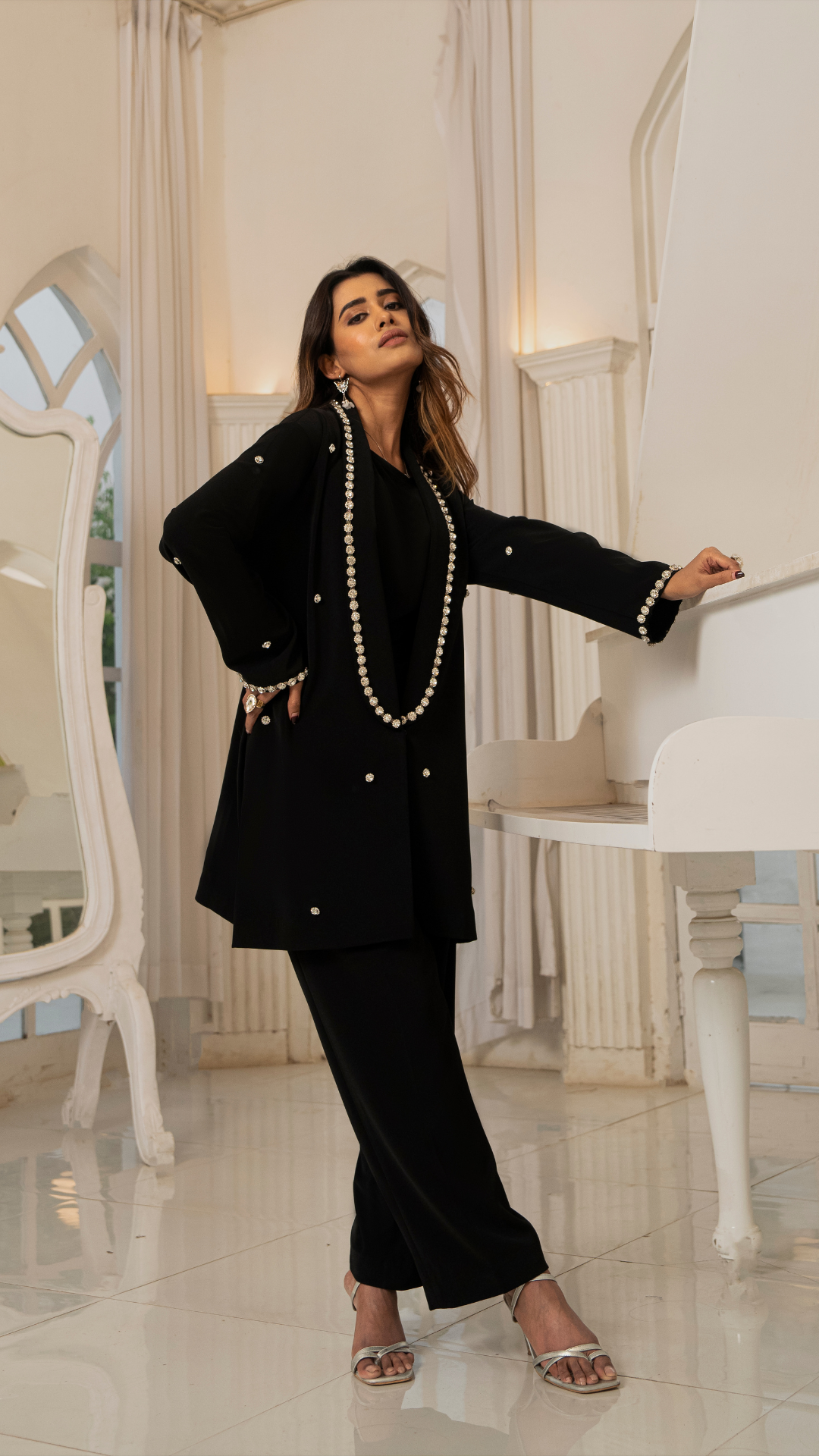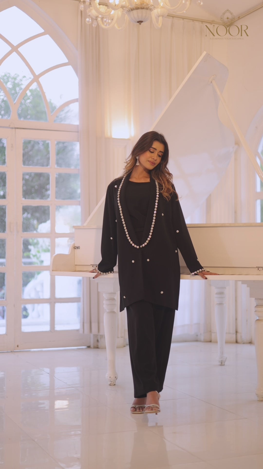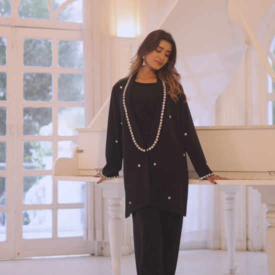 Discover "Eden," a masterpiece co-ord set designed with the discerning modern woman in mind. This luxurious ensemble showcases a crystal-embroidered jacket that dazzles with every turn, complemented by a sleek, fitted inner top and perfectly tailored straight pants. Transform your wardrobe with Eden and leave a lasting impression at every occasion!