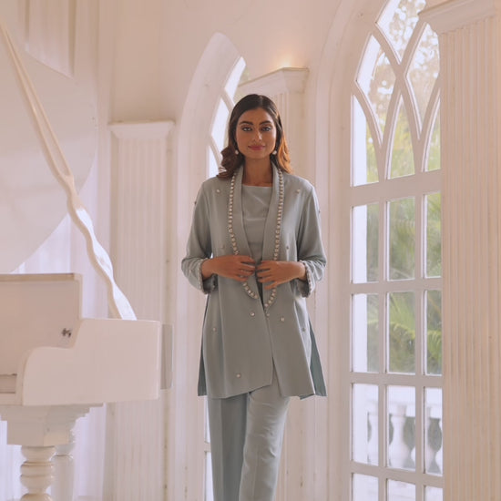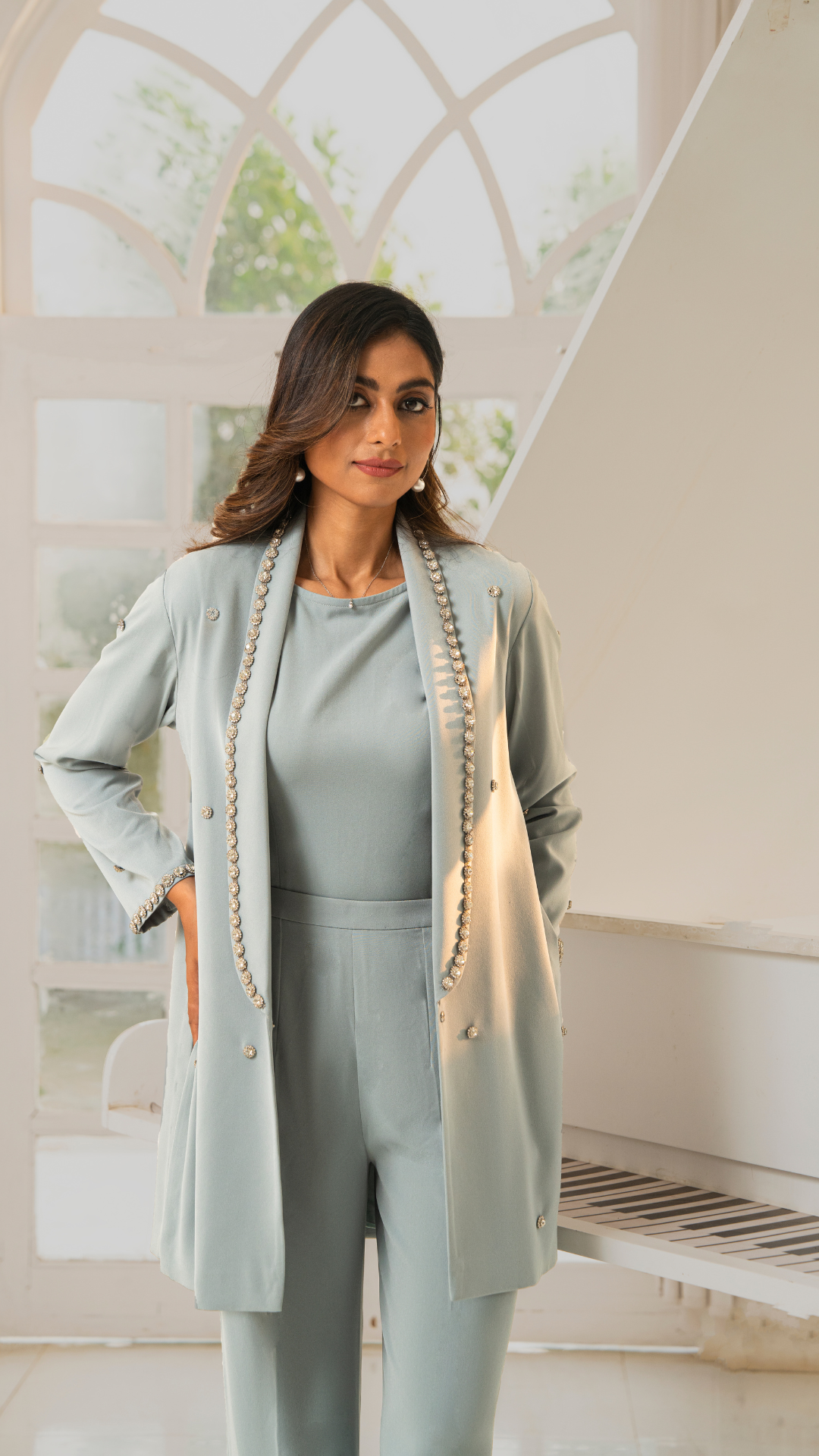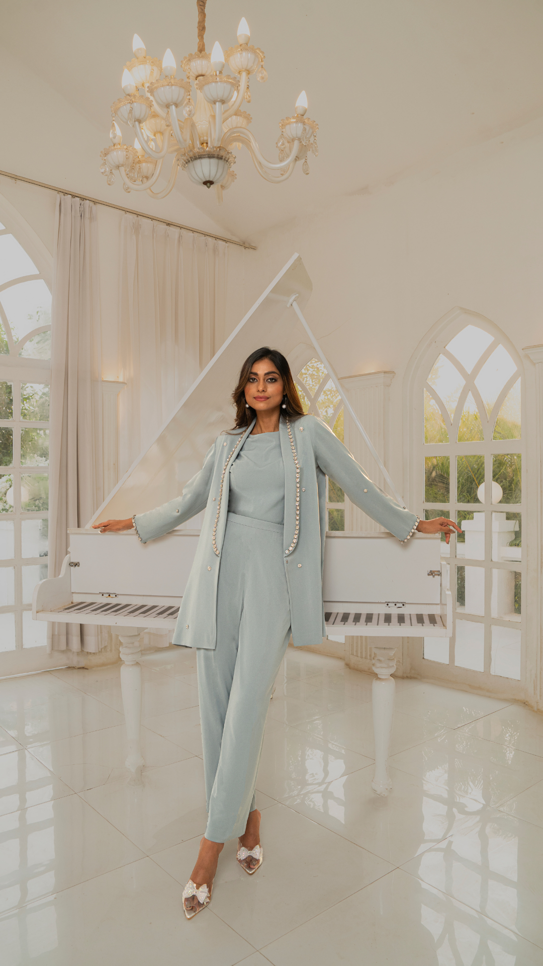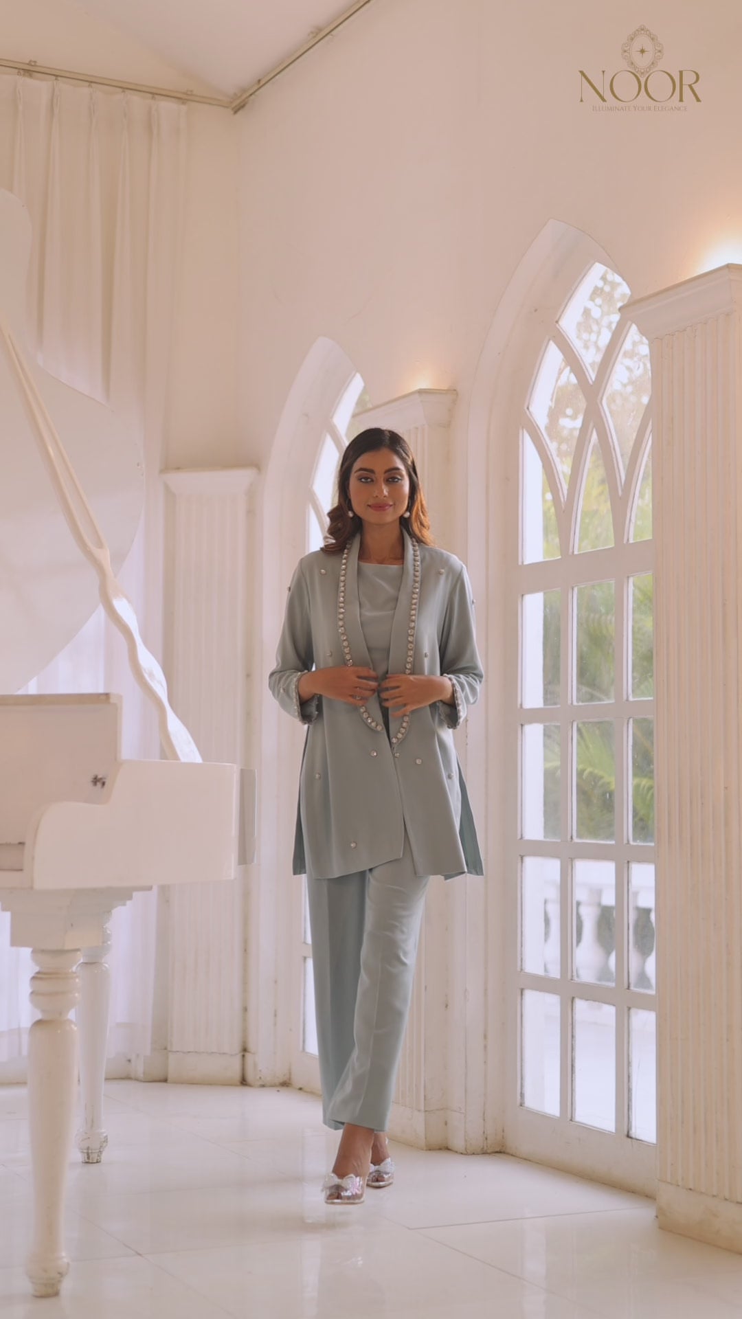 Discover "Eden," a masterpiece co-ord set designed with the discerning modern woman in mind. This luxurious ensemble showcases a crystal-embroidered jacket that dazzles with every turn, complemented by a sleek, fitted inner top and perfectly tailored straight pants. Transform your wardrobe with Eden and leave a lasting impression at every occasion!