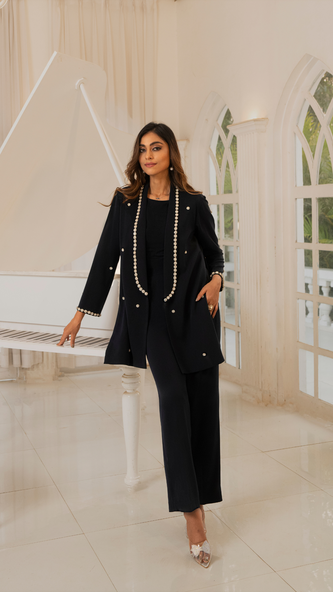 Discover "Eden," a masterpiece co-ord set designed with the discerning modern woman in mind. This luxurious ensemble showcases a crystal-embroidered jacket that dazzles with every turn, complemented by a sleek, fitted inner top and perfectly tailored straight pants. Transform your wardrobe with Eden and leave a lasting impression at every occasion!