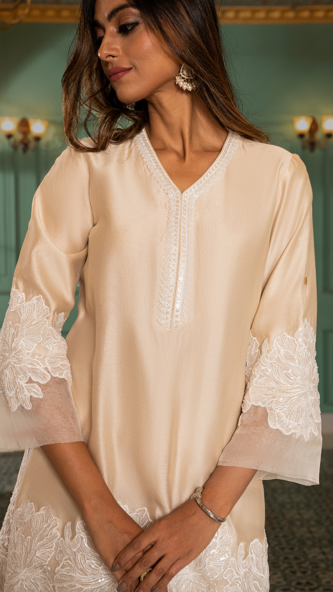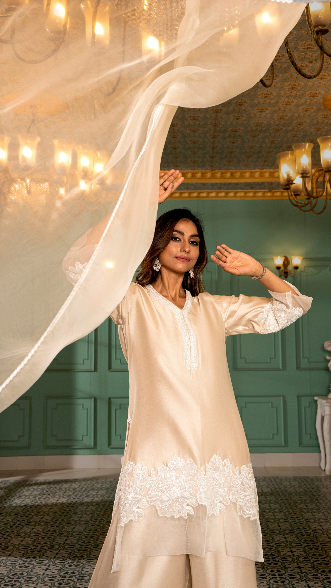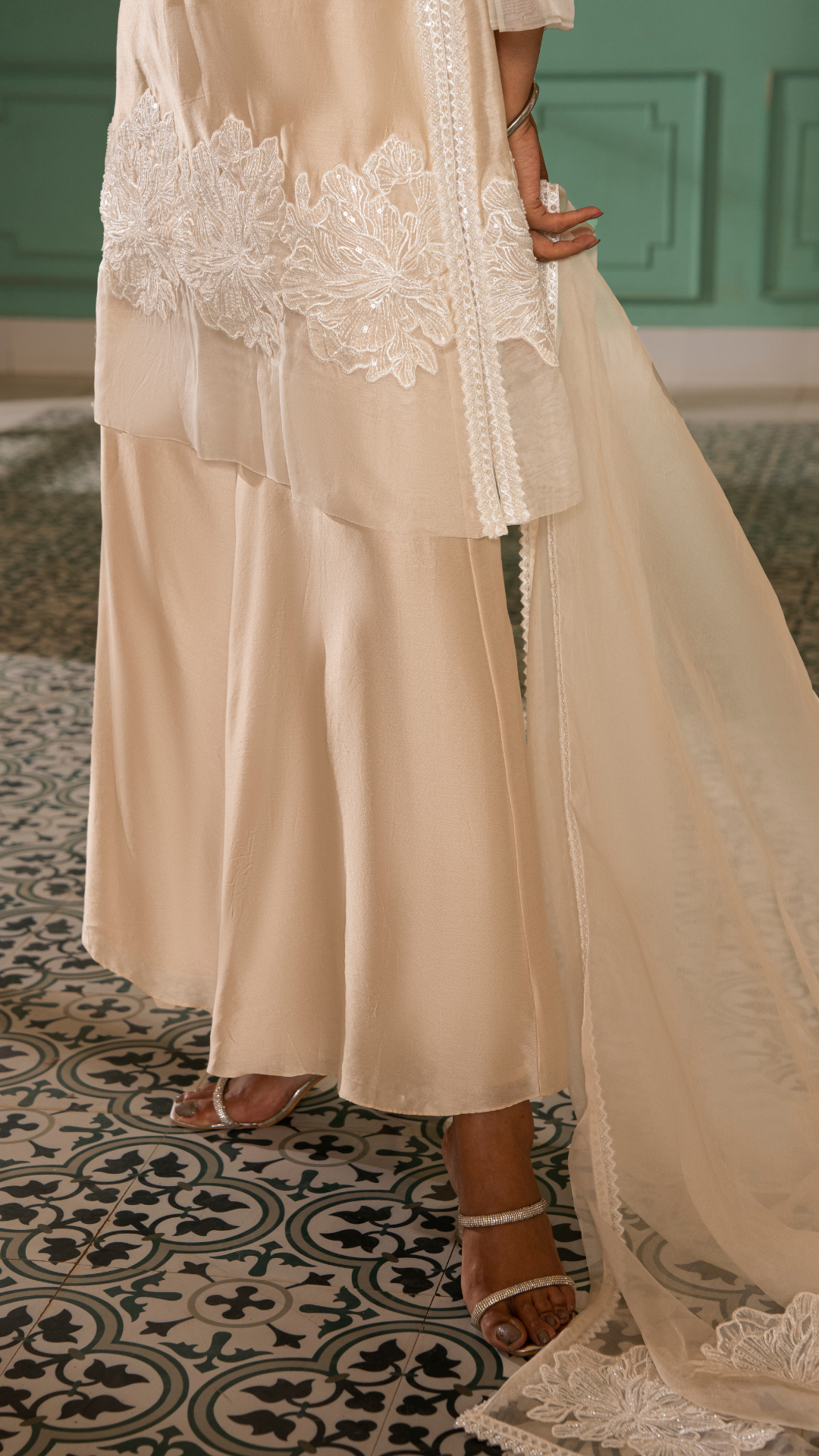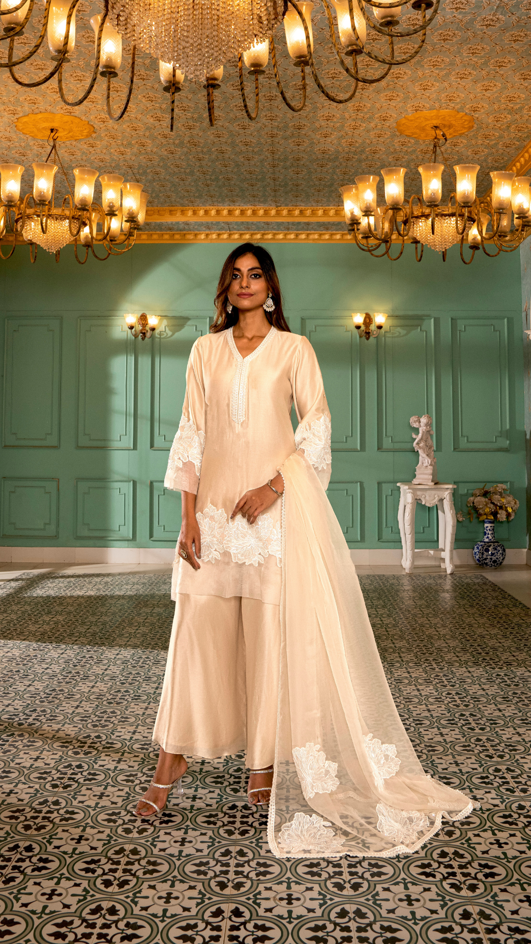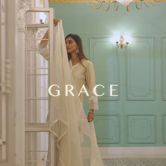 Discover "Grace," a light beige Chanderi Silk Kurta delicately embroidered with off-white Resham. This exquisite ensemble features a graceful V-neck and organza-detailed sleeves. It is paired with Chanderi flare pants, offering a harmonious blend of tradition and modern style. The outfit is completed with an organza dupatta adorned with beaded lace and embroidered floral details, creating a look of understated elegance. "Grace" is the epitome of refined beauty, perfect for any occasion.