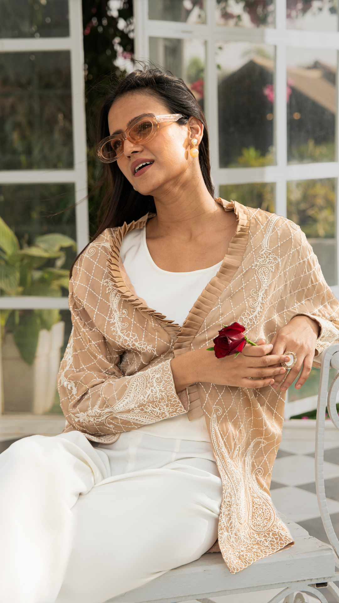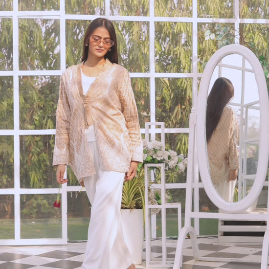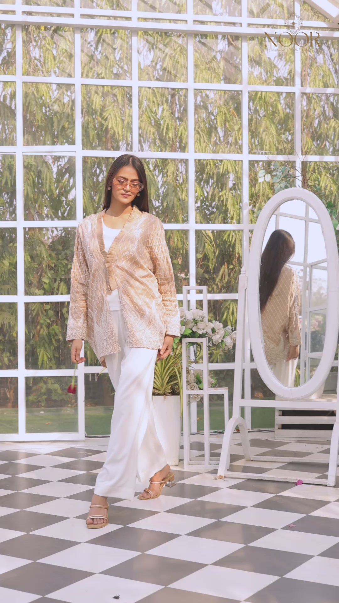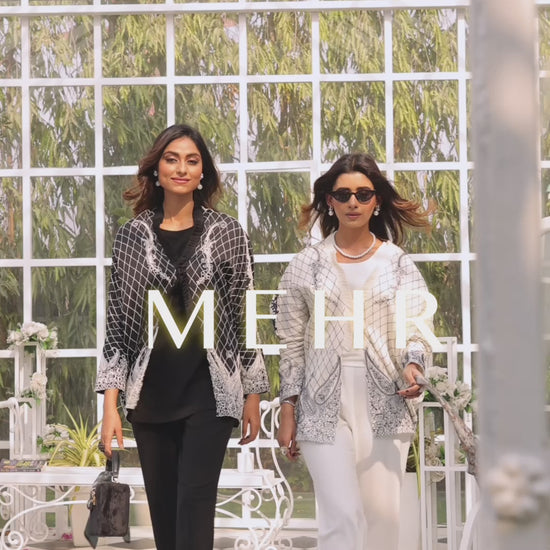 Wrap yourself in the ethereal allure of "Mehr," where the delicacy of intricate Kashmiri Resham work on satin organza speaks volumes of elegance. This ensemble is a testament to refined style, worthy of the most prestigious fashion houses. "Mehr" is not just an outfit; it's a statement of elegance, designed to captivate and charm at every occasion. Whether paired with your favorite jeans for a chic casual look or worn with an elegant saree for added sophistication, embrace the sublime beauty of "Mehr" and let your style soar to new heights.