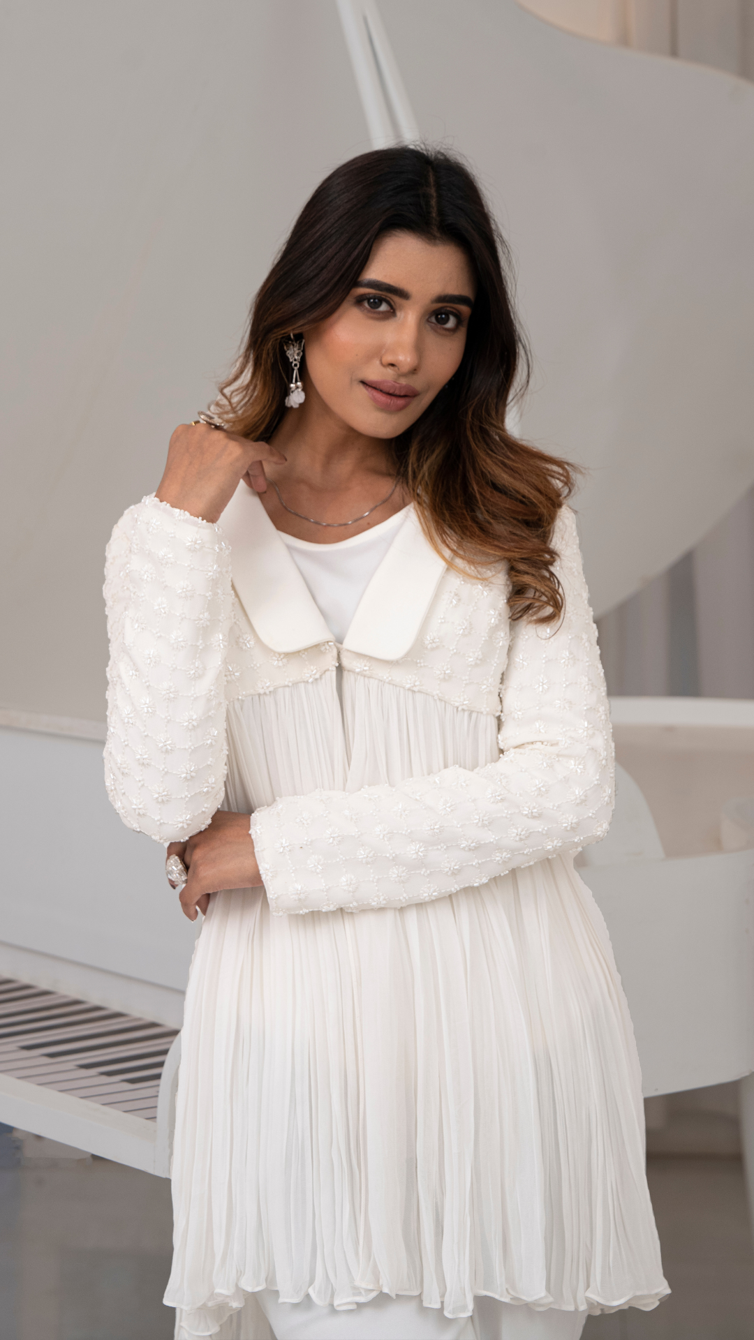 Introducing "Nola," a beautiful white ensemble that captivates with its flowing floral embroidery details. This chic jacket, adorned with exquisite embroidery, pairs perfectly with sleek straight pants, creating a look of pure elegance and sophistication. Embrace the allure of "Nola" and make a graceful statement at any occasion.