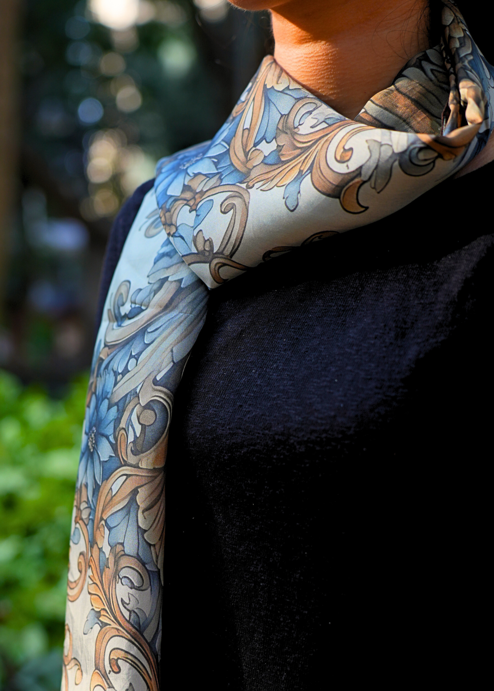 Drape yourself in opulence and artistry with our exquisitely crafted silk scarf, a tribute to the grandeur of Baroque elegance. A mesmerizing symphony of Olive Green unfolds across lustrous silk, reminiscent of the rich tapestries from a bygone era. The intricate scrollwork and ornate motifs whisper tales of regal splendor, making it a timeless accessory for the modern muse.