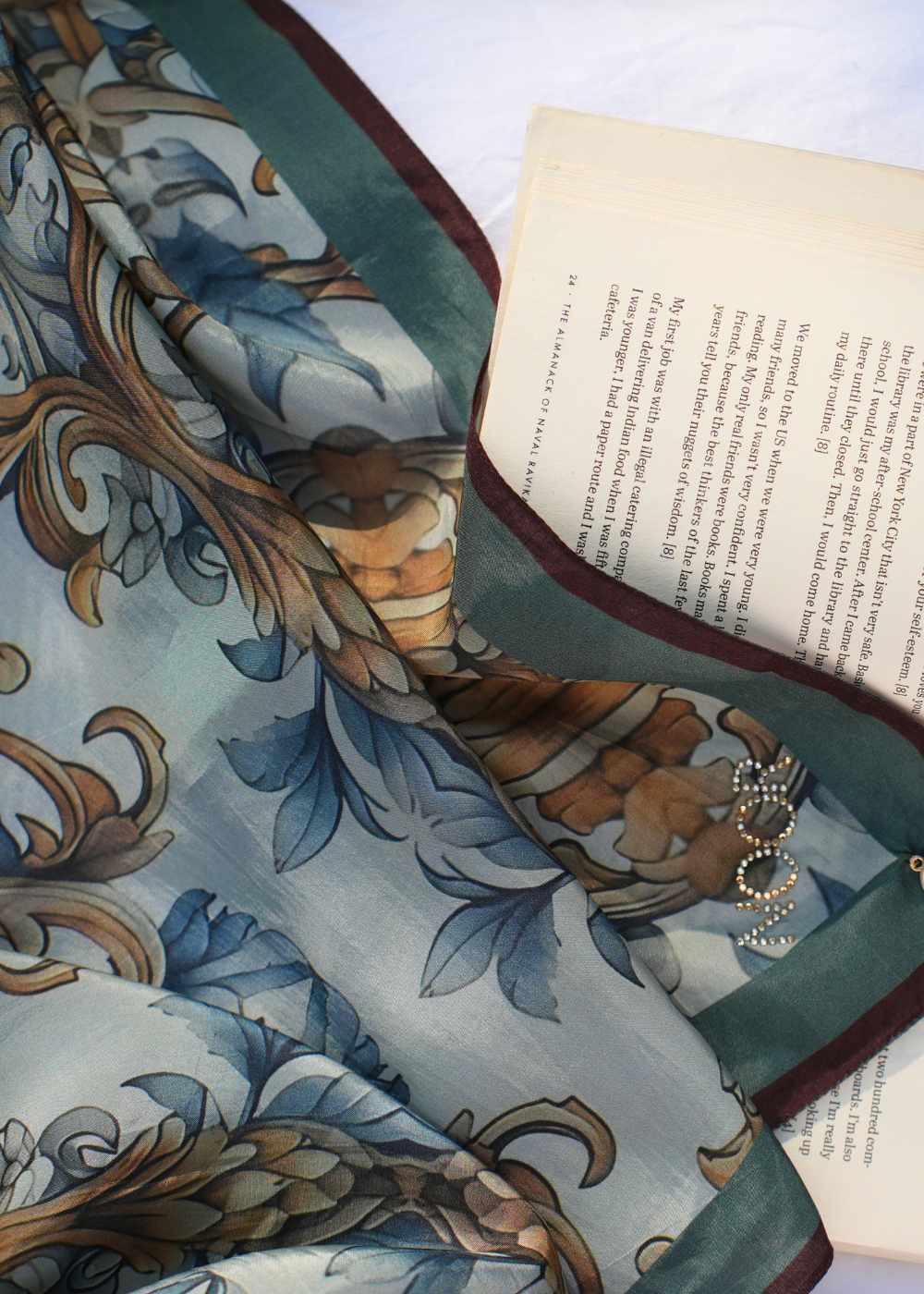 Drape yourself in opulence and artistry with our exquisitely crafted silk scarf, a tribute to the grandeur of Baroque elegance. A mesmerizing symphony of Olive Green unfolds across lustrous silk, reminiscent of the rich tapestries from a bygone era. The intricate scrollwork and ornate motifs whisper tales of regal splendor, making it a timeless accessory for the modern muse.