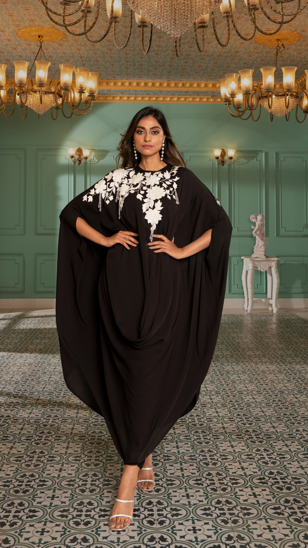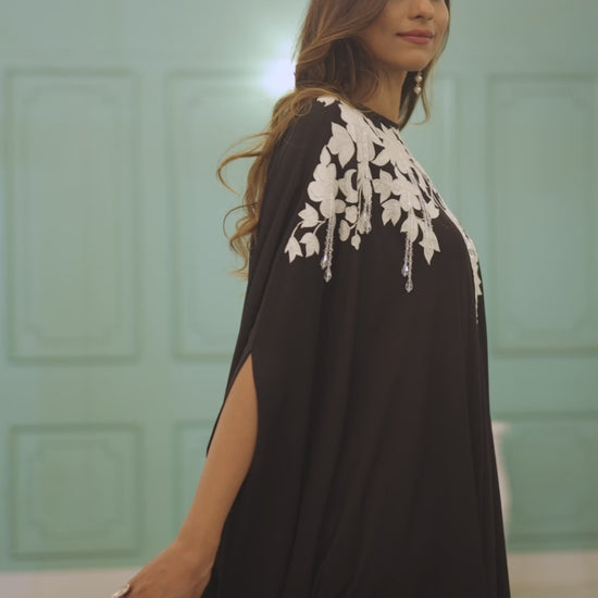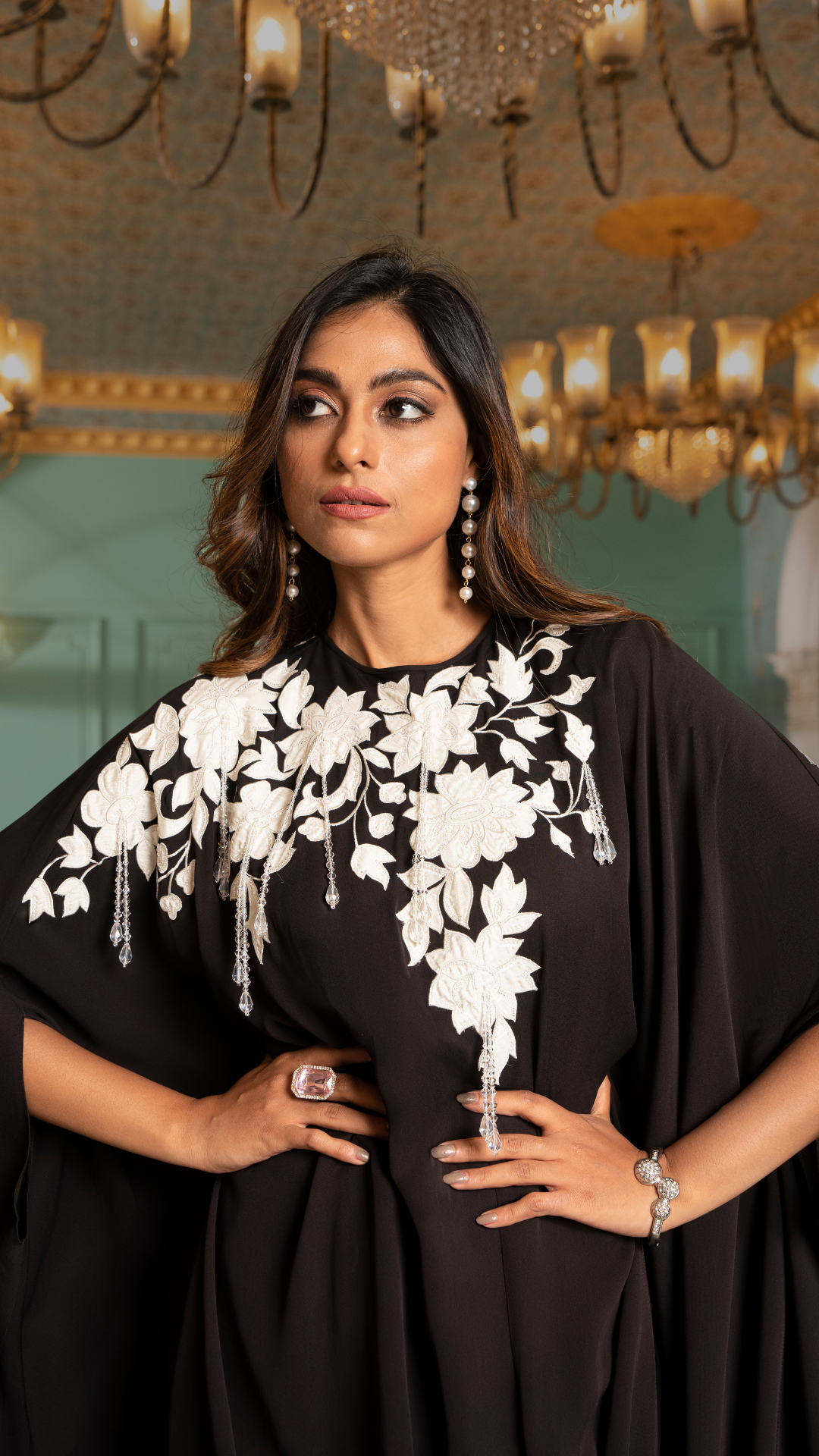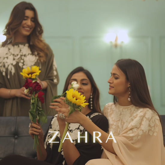 Introducing "Zahra," an exquisite cape crafted from the finest Georgette. This elegant piece features stunning floral patch embroidery and handcrafted bead tassels, flowing gracefully with every movement to offer a blend of sophistication and ease. Perfect for both day and evening affairs, "Zahra" ensures you look and feel your best. Elevate your style with "Zahra" and embrace effortless classiness today.